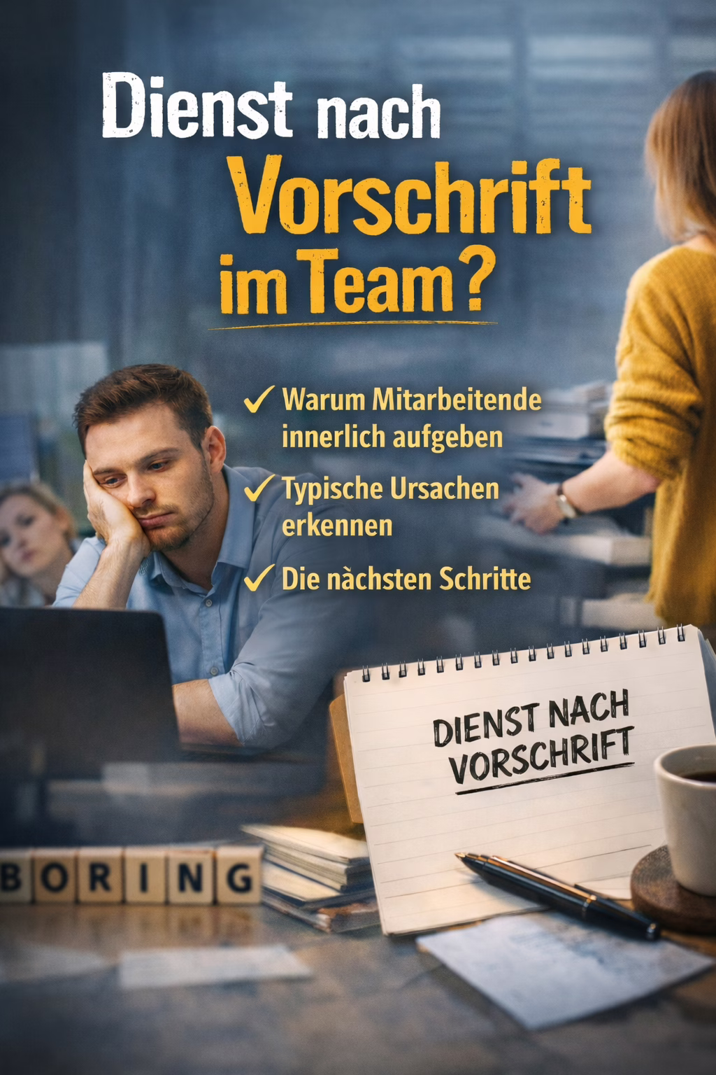Dienst nach Vorschrift im Team erkennen, High Performer halten und eine gesunde Unternehmenskultur aufbauen. So arbeite ich mit Unternehmen, wenn Motivation, Verbindung und Leistung verloren gegangen sind.
